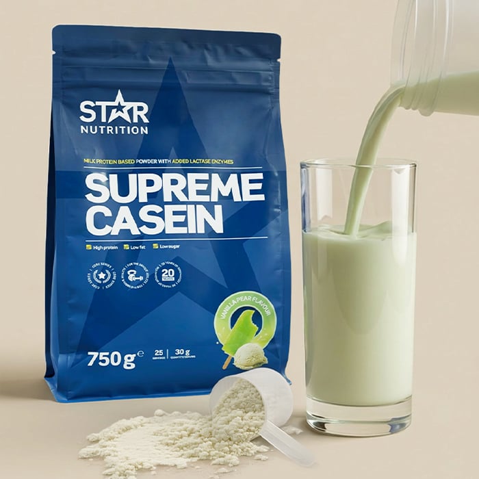 Supreme Kasein från Star Nutrition är ett långsamt frisatt kaseinprotein som ger dig 25 g fullvärdigt protein per portion och en krämig konsistens som håller dig mätt längre. Tillverkat av mjölkproteinkoncentrat och berikat med laktasenzym är det även lämpligt för dig som är känslig för laktos. Perfekt som kvällsprotein, proteinpudding eller ett mättande mellanmål för effektiv återhämtning och daglig energi.