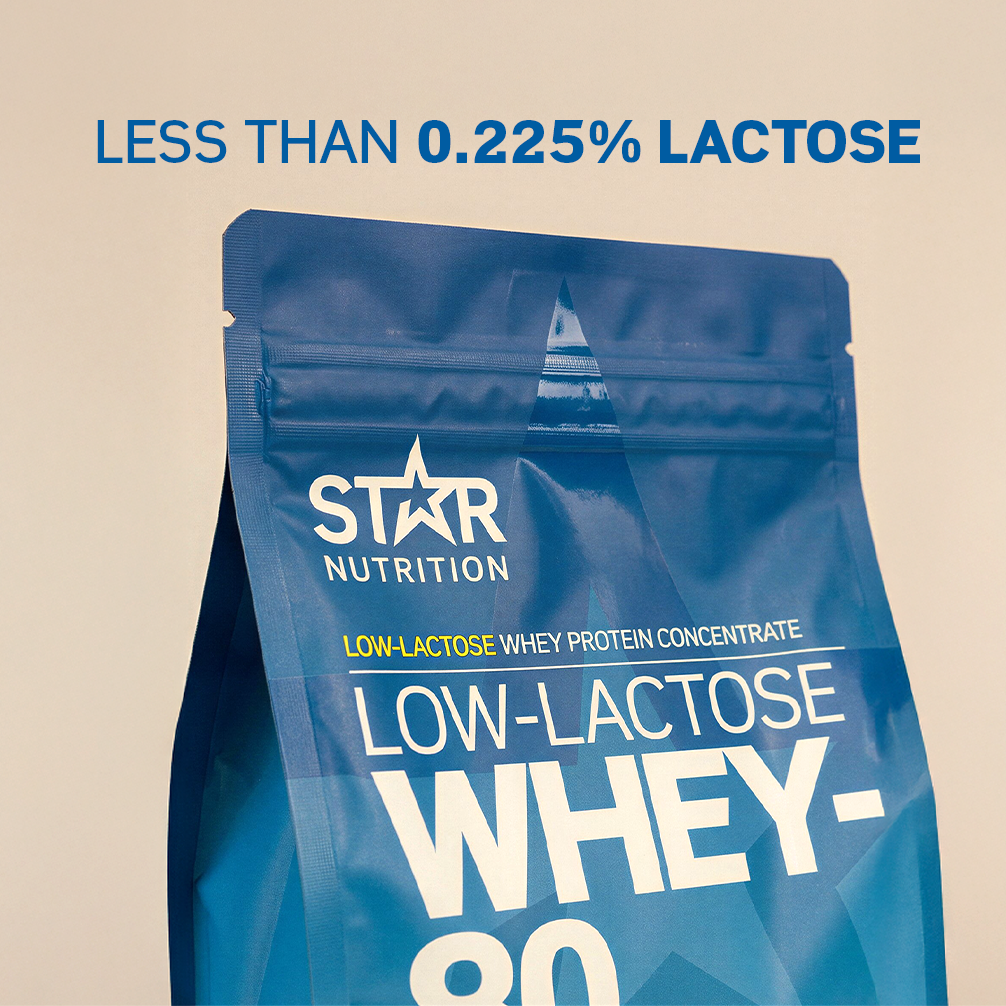Produkten innehåller 0,225 % laktos, vilket motsvarar 0,033 g laktos per 100 ml färdigblandad dryck. Den låga laktoshalten gör Whey-80 Low-Lactose® till ett alternativ för dig som vill minska ditt laktosintag men samtidigt få i dig en betydande mängd högkvalitativt protein per portion.